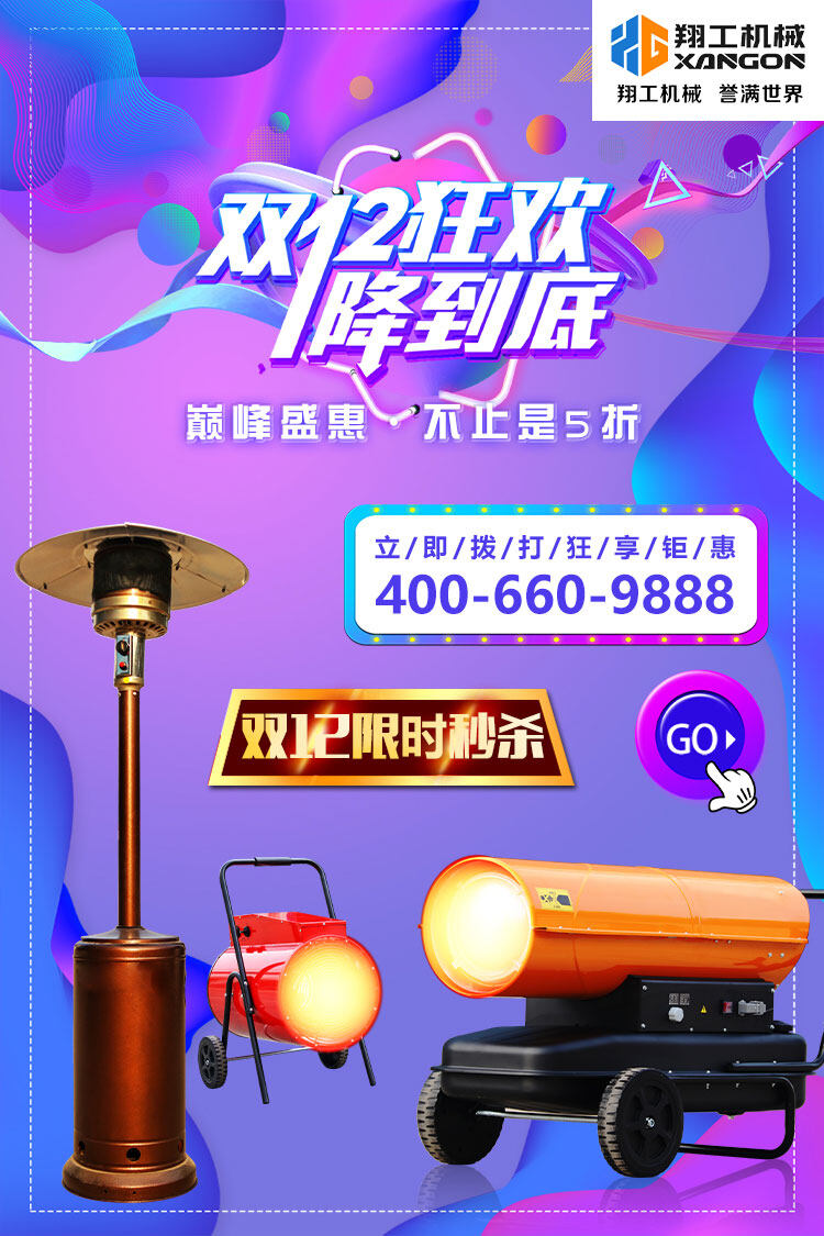 雙12值得買的就是它 便宜,便宜,再便宜惠; 就是這么簡單、粗暴 為回饋新老客戶一直以來的厚愛與支持, 雙12鉅惠開始啦 凡在此期間購買翔工機(jī)械的取暖設(shè)備都可享受便宜的價(jià)位 實(shí)惠多多,不容錯(cuò)過