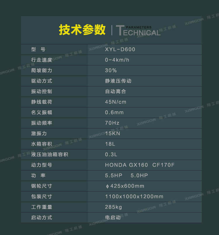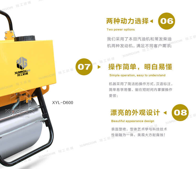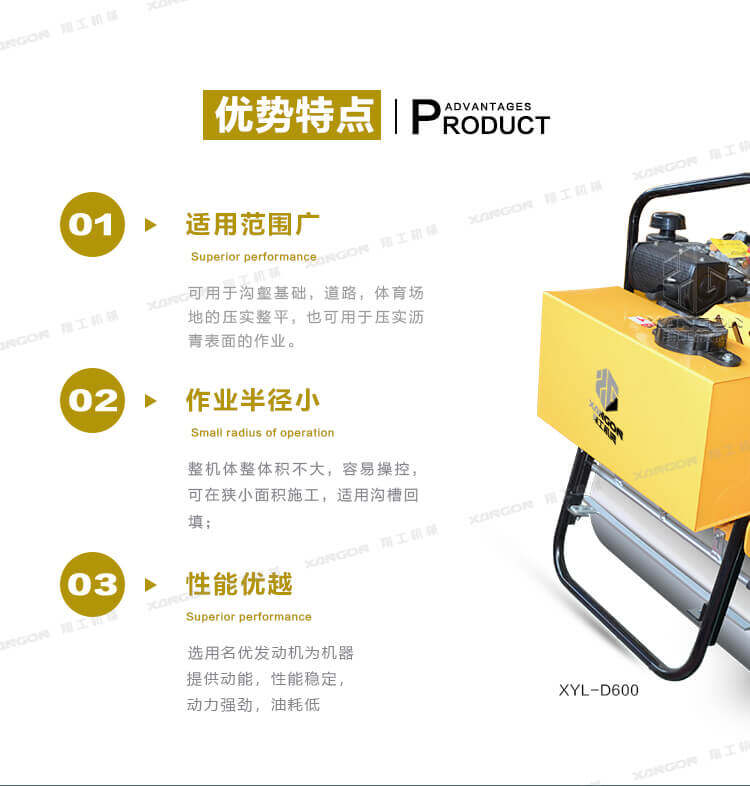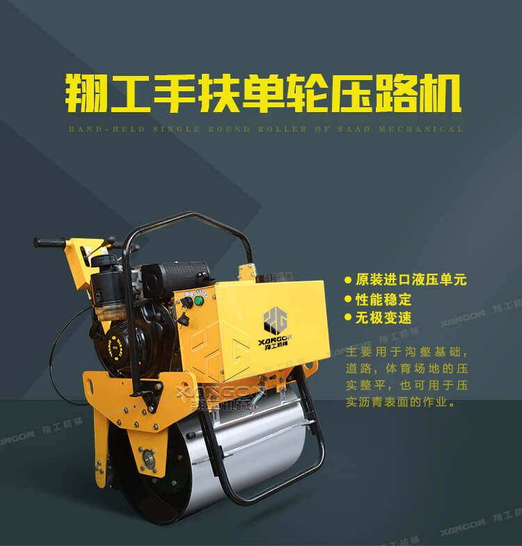 手扶單輪(汽油)壓路機(jī)進(jìn)口液壓系統(tǒng)手扶壓路機(jī)XYL-D600主要用于溝渠基礎(chǔ),道路,體育場(chǎng)地的壓實(shí)整平,也可用于壓實(shí)瀝青表面的作業(yè)。