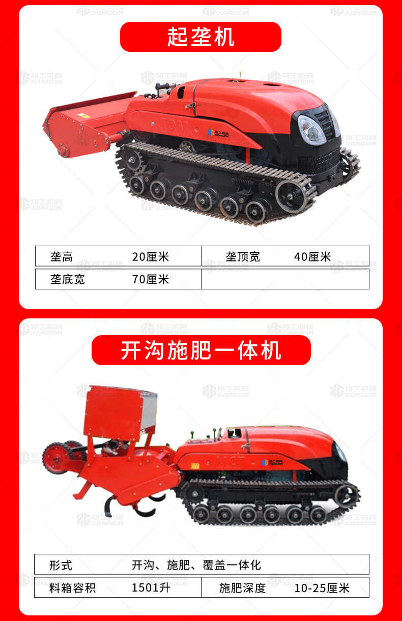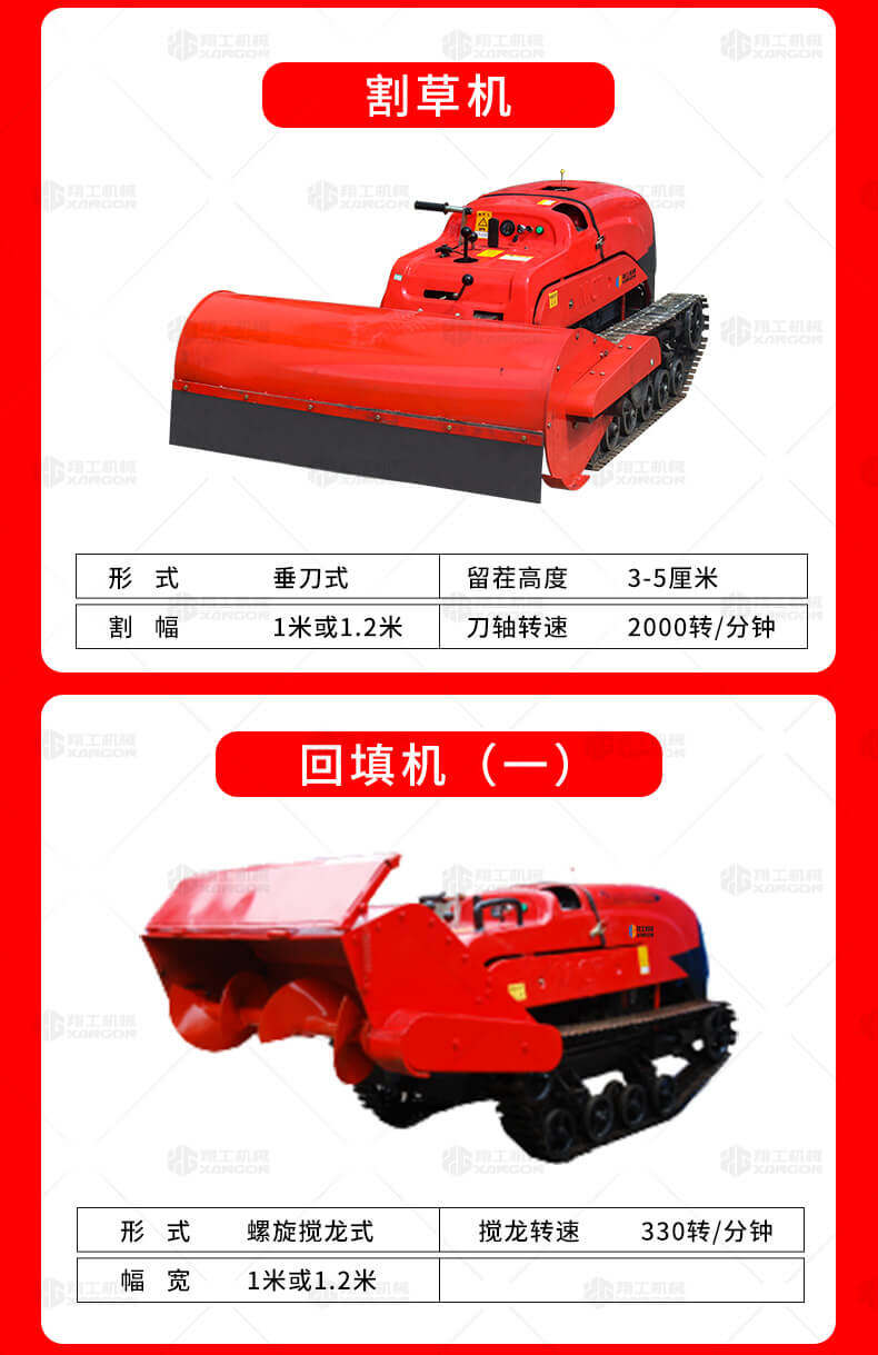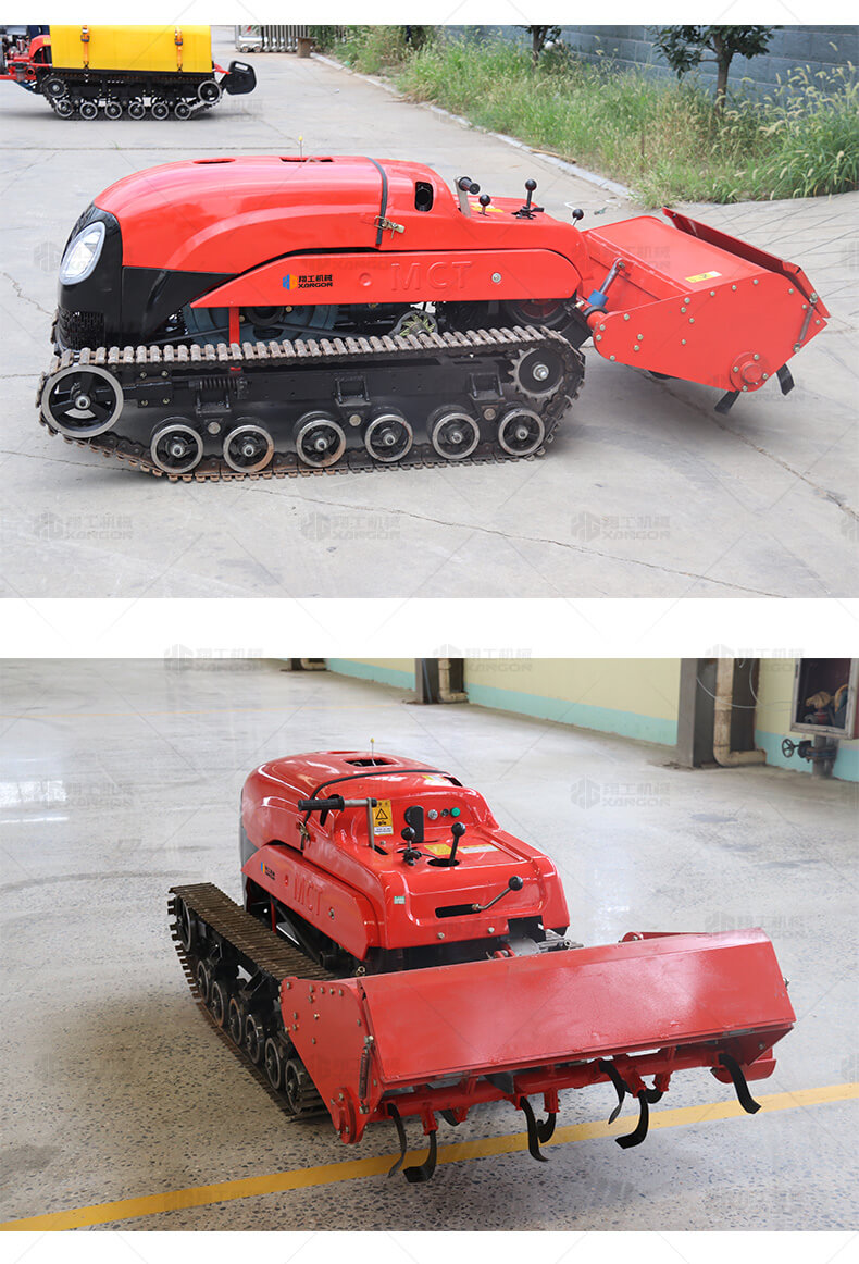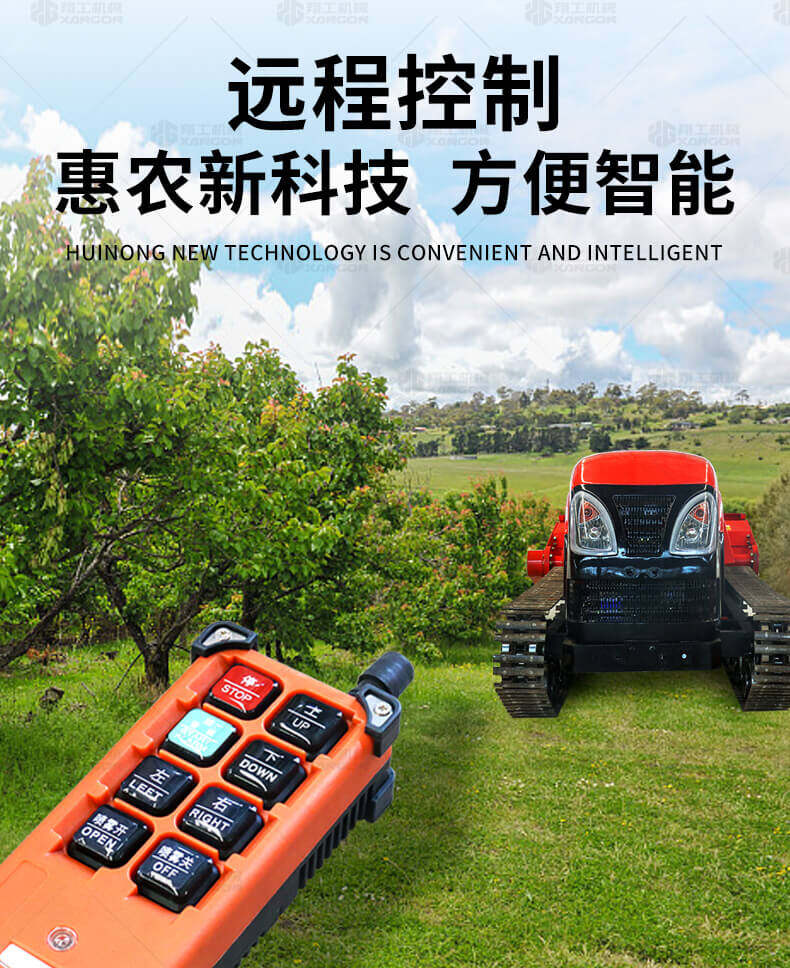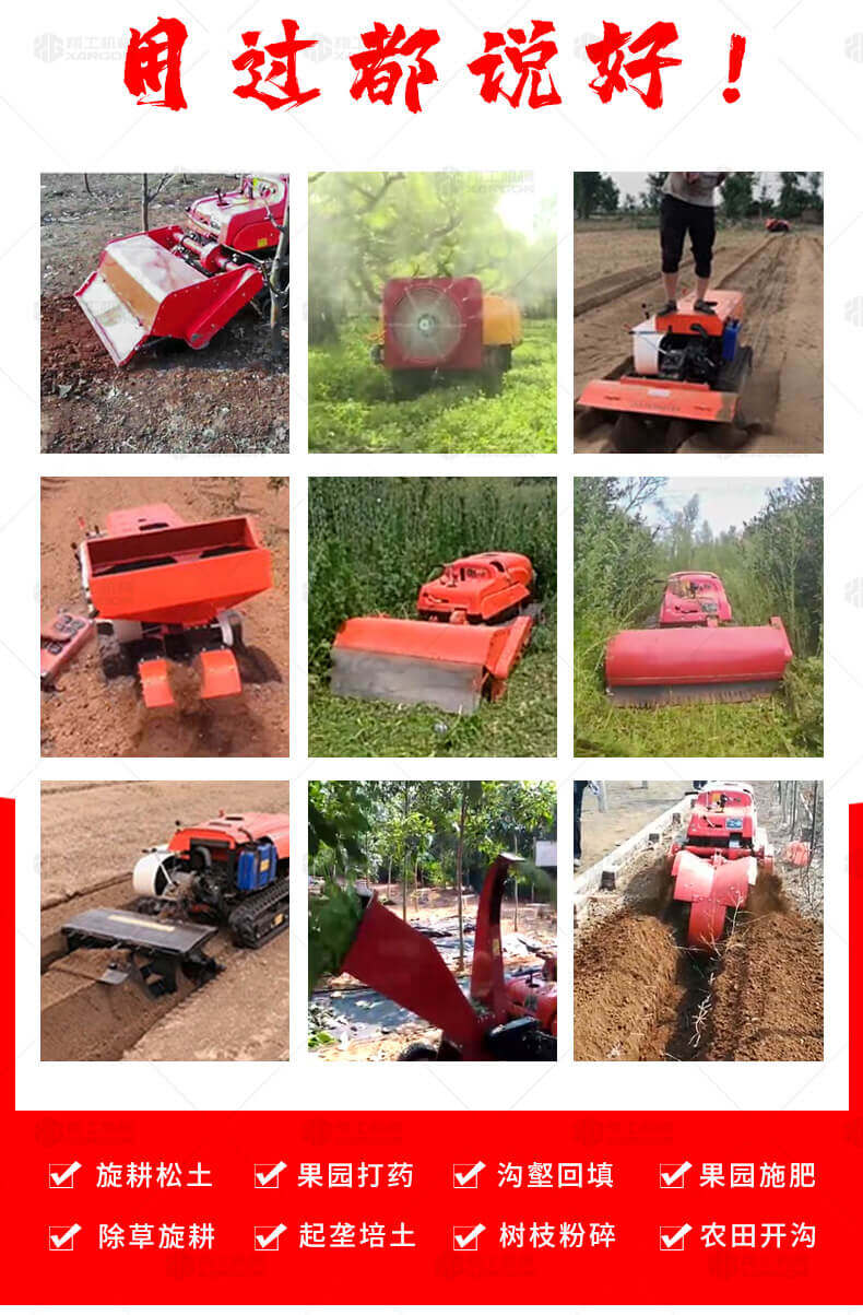 本產(chǎn)品操作方式為遙控操作,車身超低,可原地轉(zhuǎn)向,是專門針對果園開發(fā)的新型產(chǎn)品。主機(jī)可配裝多種機(jī)具,可旋耕,除草,開溝,割草,施肥等,適用于各種果園樹下的田間管理。省力效率高,節(jié)省勞力減輕勞動強(qiáng)度。