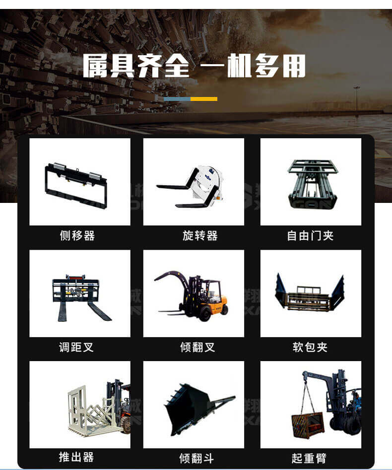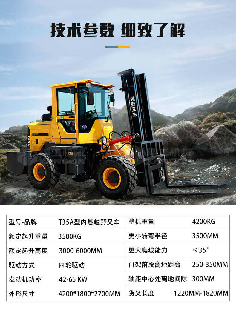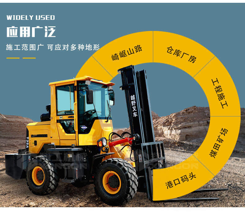 越野叉車可以在坡地和不平地面上進(jìn)行貨物裝、卸、堆垛及搬運(yùn)作業(yè),具有良好的機(jī)動(dòng)性、越野性可靠性。其功能多樣,可搭配側(cè)移器、調(diào)距叉、旋轉(zhuǎn)器、軟包夾、推出器、側(cè)翻叉、側(cè)翻斗、起重臂等工具完成不同的工作。