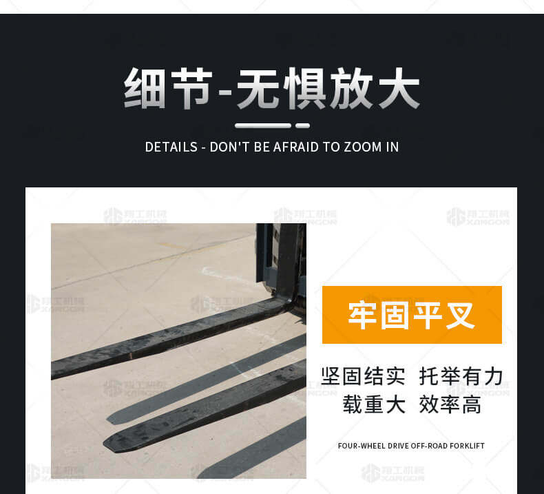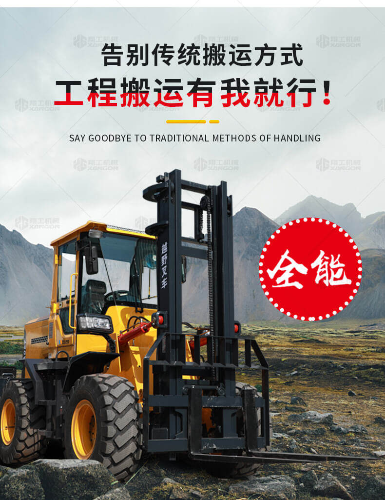5.越野叉車發(fā)動機功率大,采用全輪驅(qū)動和越野輪胎。