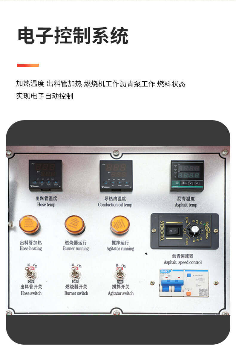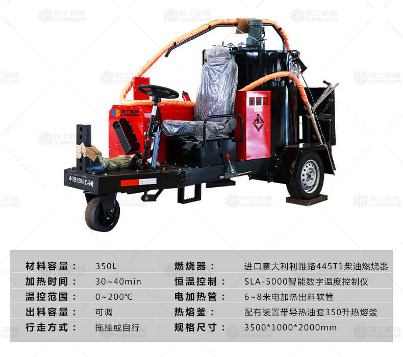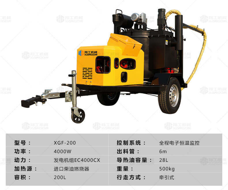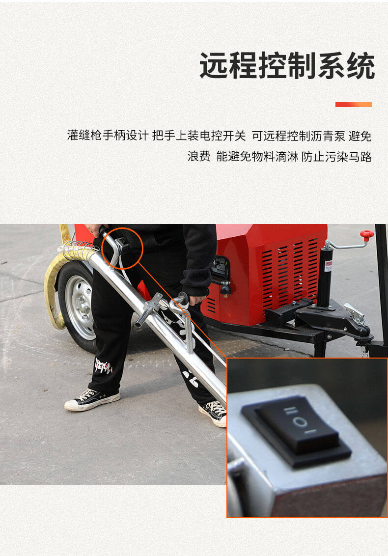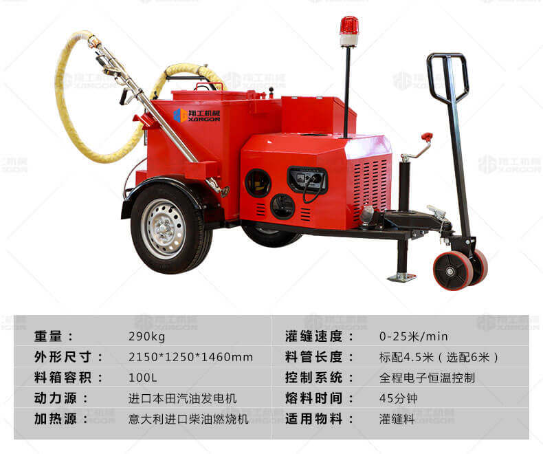 灌縫機(jī)主要有手推式和自行式手持灌縫管操作,采用進(jìn)口柴油燃燒器加熱。在工作時(shí)首先在料箱內(nèi)加入瀝青或灌縫膠,啟動(dòng)發(fā)電機(jī)供電,依次間斷打開導(dǎo)熱油泵開關(guān),燃燒器開關(guān),出料管加熱開關(guān);