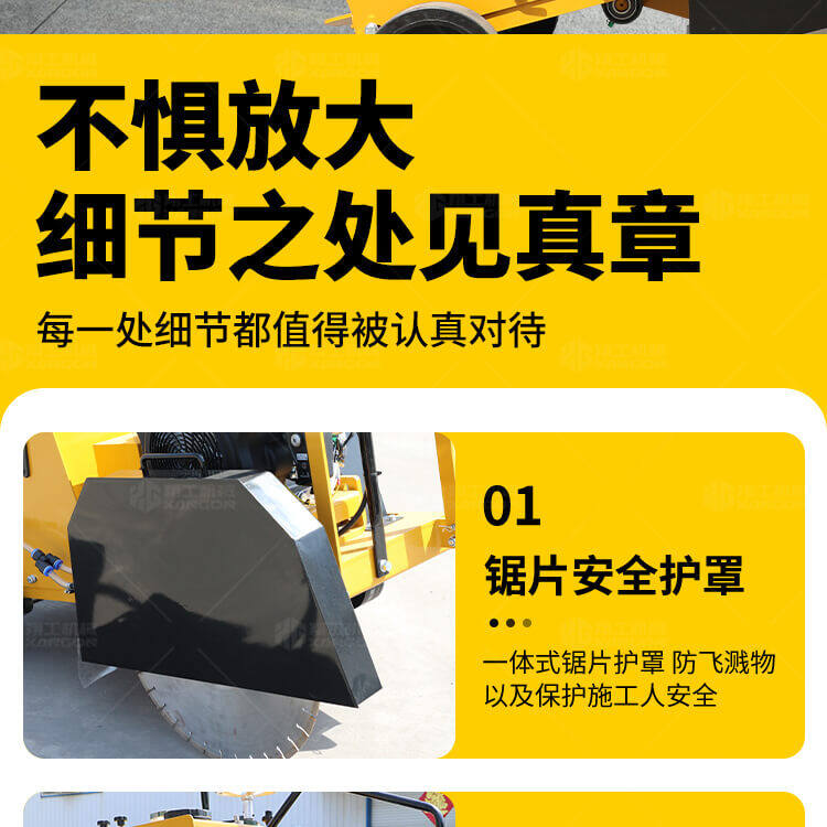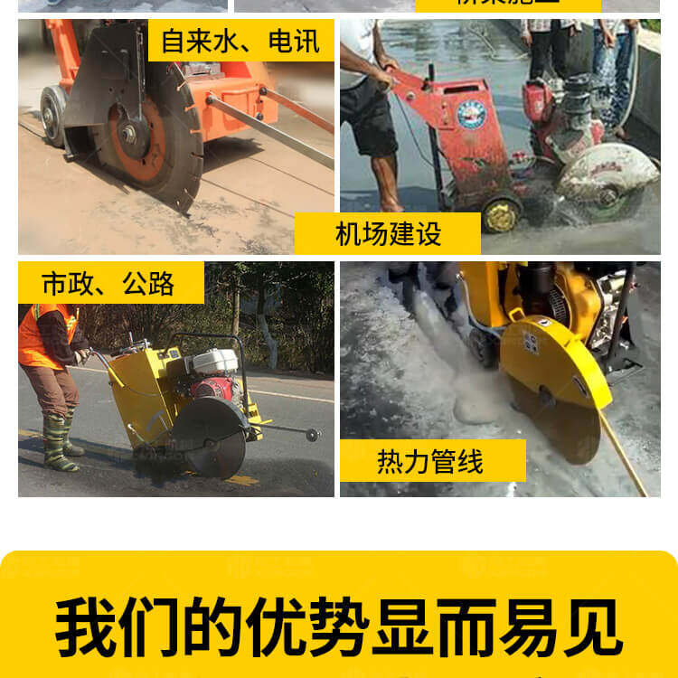 大鋸片大直經(jīng)馬路切割機(jī)自帶水源,降塵降溫,刀片使用壽命長。