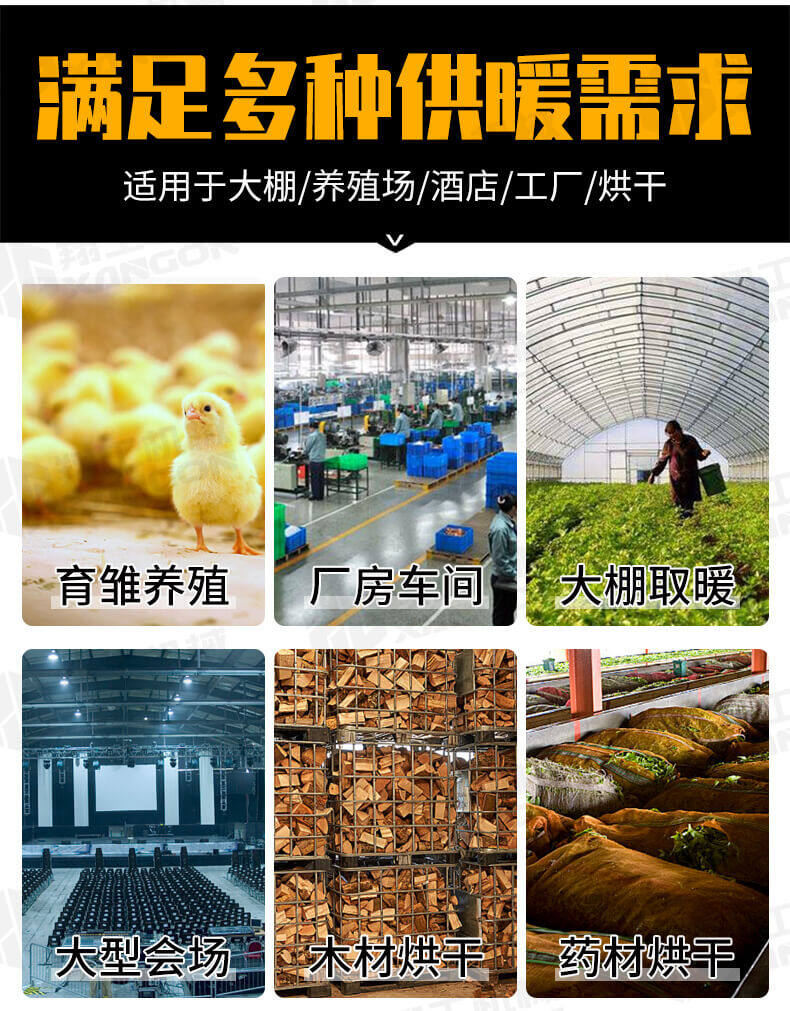 溫室加熱、育雛養(yǎng)殖、畜牧供暖、菌棚保溫、木材解凍、大棚種植保溫等
