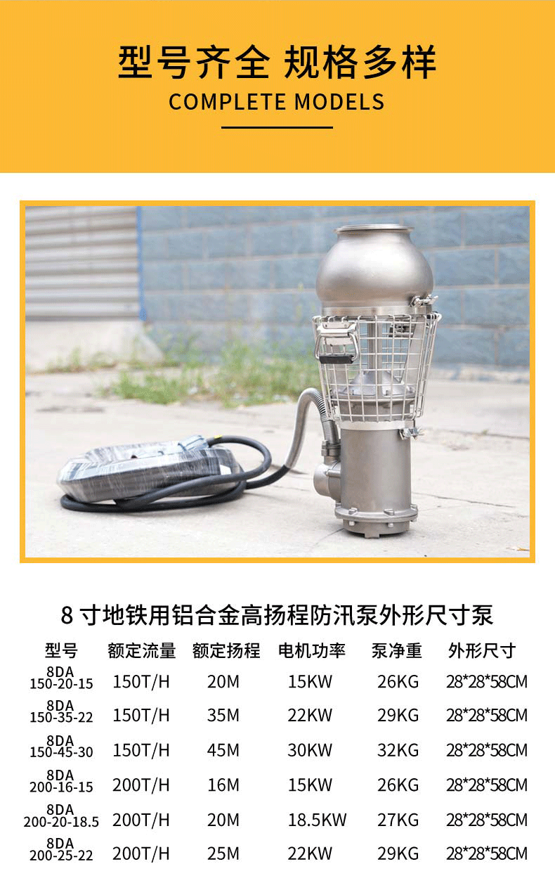 8寸地鐵防汛泵,鋁合金材質(zhì),高揚(yáng)程設(shè)計(jì),排水高效,耐腐蝕性強(qiáng),輕便易移動,專用于地鐵防汛搶險,保障地下空間安全。