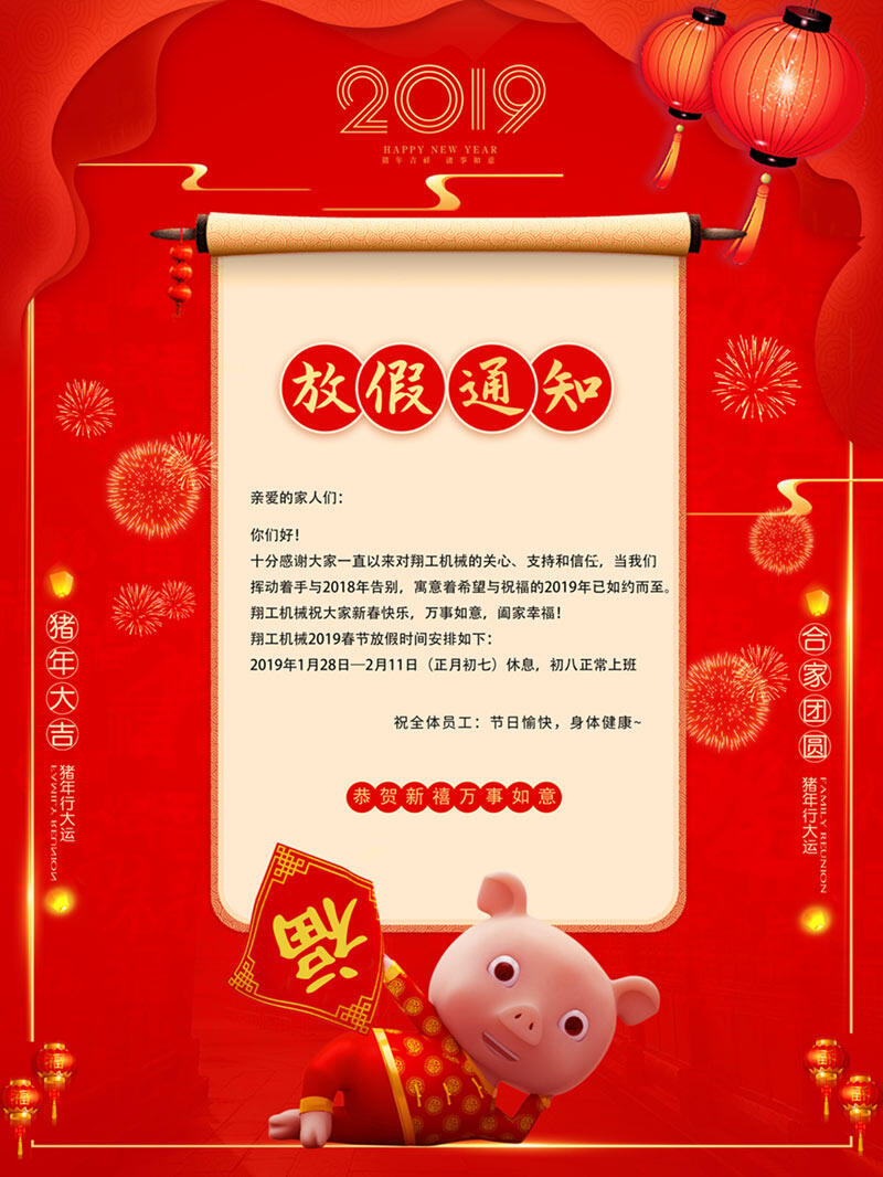 在2019年春節(jié)到來之際,翔工機(jī)械感謝大家對(duì)我們一如既往的支持與信任!在此我們獻(xiàn)上節(jié)日的問候與祝福: